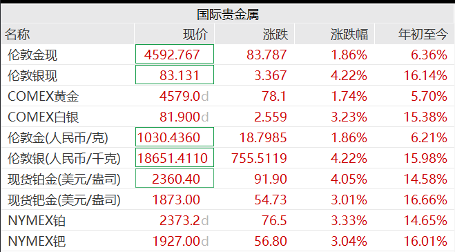 1月12日早盘,贵金属集体拉升。截至发稿,现货黄金升至4592美元大关,涨幅1.86%再创历史新高;现货白银涨幅扩大至3.36%。现货铂金涨4.05%,突破2360美元/盎司关口,最新报2360.4美元/盎司。