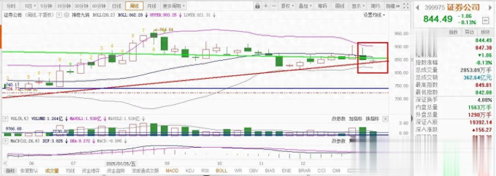 第二点:分时走势来看,目前又处于3浪2调整浪的末期或3浪3反弹的初期阶段,其能否如期开展3浪3的反弹,还需要留意下方的支撑与上方的压力。这一点,从证券公司指数周K线走势图(如下图)中,最能得到体现。