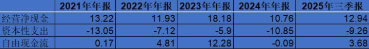 庞大的资本性支出远远大于扣非净利润的情况下,信维通信的自由现金流表现很差。从下图信维通信2021年至2025年三季度自由现金流发展情况来看。信维通信虽然通过经营活动能创造不错的经营净现金流,但是由于庞大的资本性支出的存在,信维通信的自由现金流整体比较差。
