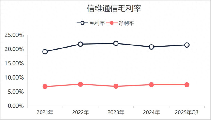 我为什么说信维通信赚个辛苦钱而已,最明显的就是看信维通信的毛利率和净利率情况。从下图信维通信2021年至2025年三季度的毛利率和净利率情况来看,信维通信的平均毛利率为20%,平均净利率7%左右的样子,赚钱并不容易。