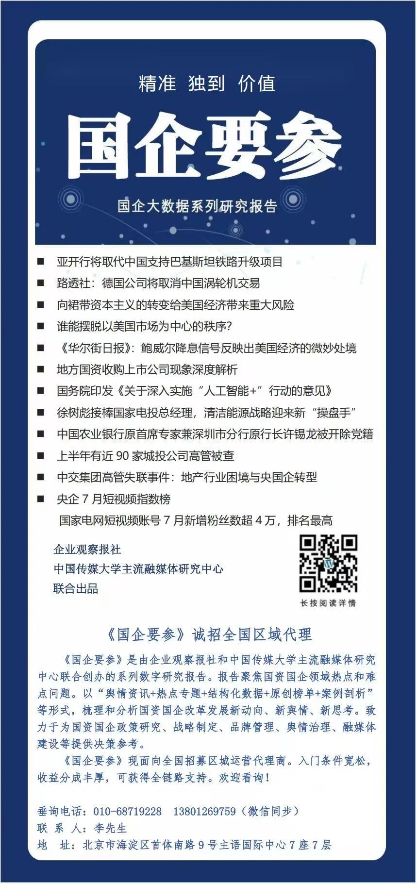 企观国资是企业观察报社官方微信公众号。《企业观察报》是由国务院国资委指导、中国企业改革与发展研究会主管主办的全媒体平台,被国务院国资委认定为“国资国企自有舆论平台”,致力于以专业化、市场化、国际化视角关注报道中国企业改革发展。